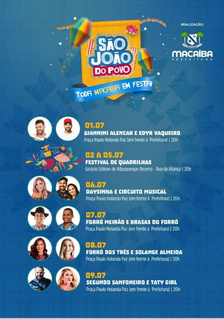 Após uma vasta programação junina na zona rural do município promovida, de forma inédita, pela Prefeitura, gestão do prefeito Emídio Jr., durante todos os finais de semana do mês de junho, o São João do Povo de Macaíba desembarca na zona urbana com intensa programação a ser realizada durante nove dias consecutivos. Os cenários serão a Praça Paulo Holanda Paz (Pista Nova) e o Ginásio Edílson Albuquerque.