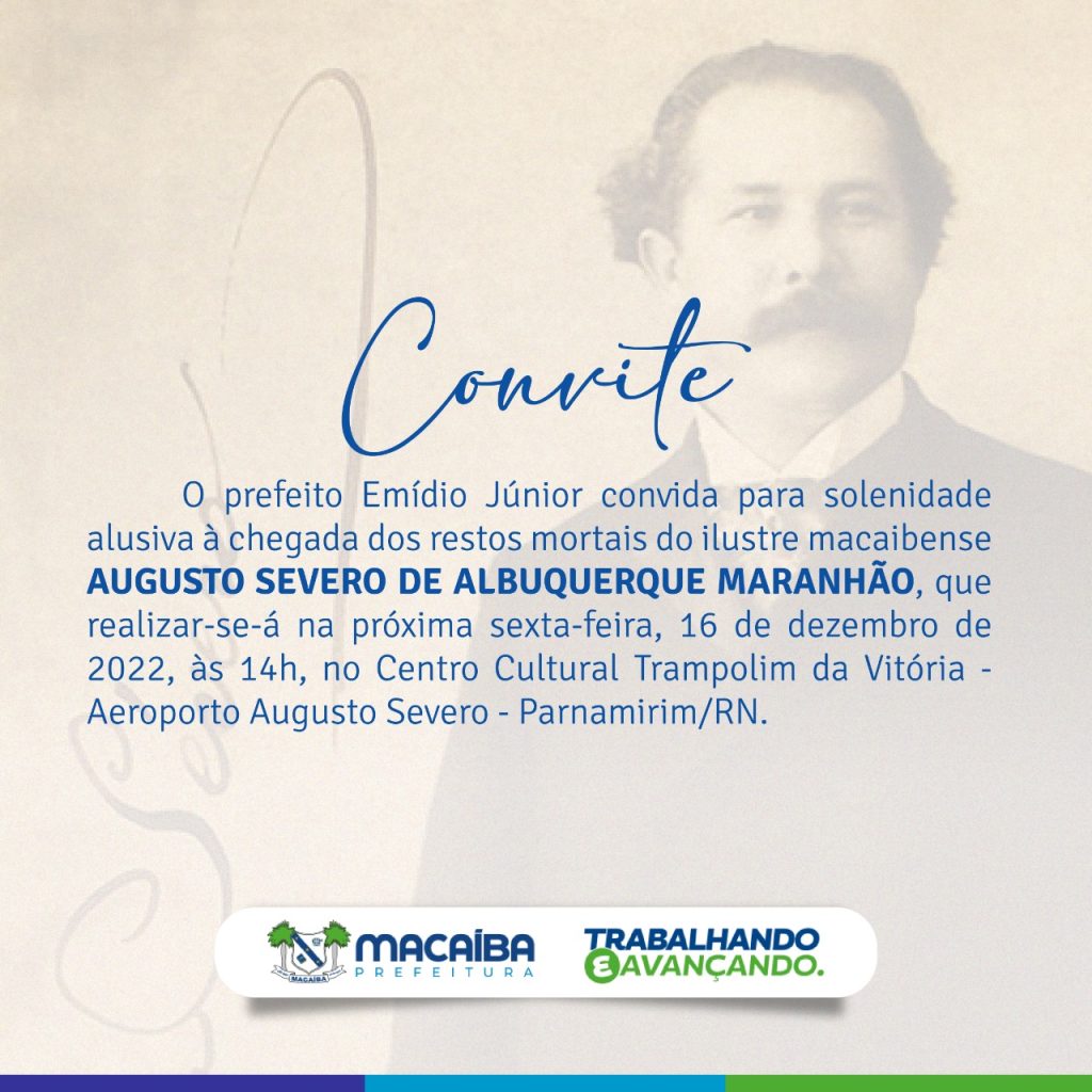 Cabe destacar que o prefeito Emídio Júnior participou do processo de exumação dos restos mortais do ilustre macaibense, no Rio de Janeiro, na última segunda-feira (05/12). O gestor municipal de Macaíba integra a Comissão Organizadora dos 120 anos do encantamento de Augusto Severo constituída por representantes da Prefeitura de Macaíba e do Governo do Estado do Rio Grande do Norte, entre eles, o vice-governador Antenor Roberto; pelo jurista Armando Holanda; a representante da Academia Norte-rio-grandense de Letras, Leide Câmara e o vice-presidente da Fecomércio/RN, Luiz Antônio Lacerda. A comissão contou ainda com a nobre presença de Mário Sérgio Albuquerque Maranhão, bisneto do macaibense Augusto Severo, além de Rondinelli Dantas, diretor-presidente do MacaíbaPREV.