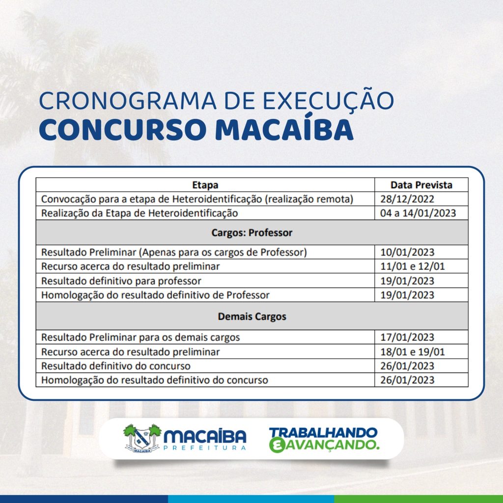 O cronograma abrange datas entre o período de 28 de dezembro (convocação para a etapa de heteroidentificação), que será realizada de forma remota, até 26 de janeiro do próximo ano, quando o resultado e a homologação do concurso deverão ser publicados por ambas as partes: Prefeitura de Macaíba e Consulplan. O cronograma e seus detalhes podem ser acessados mediante este link: https://d3du0p87blxrg0.cloudfront.net/concursos/1510/219_160044.pdf