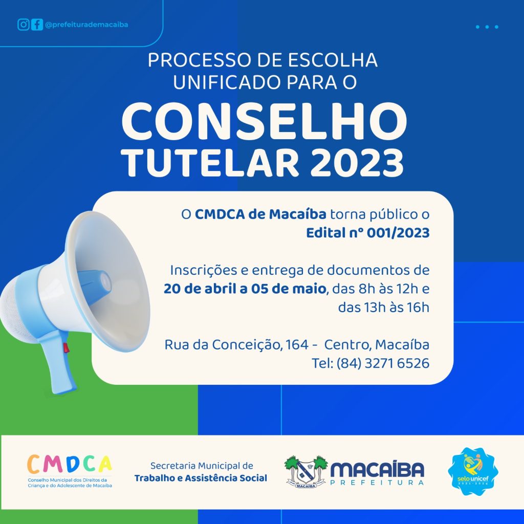 O município de Macaíba publicou no Diário Oficial desta segunta-feira (03) o edital do processo de escolha dos Conselheiros Tutelares para o quadriênio 2024 / 2028. O processo de escolha será conduzido pela Comissão Especial Eleitoral designada pelo Conselho Municipal dos Direitos da Criança e do Adolescente (CMDCA).
