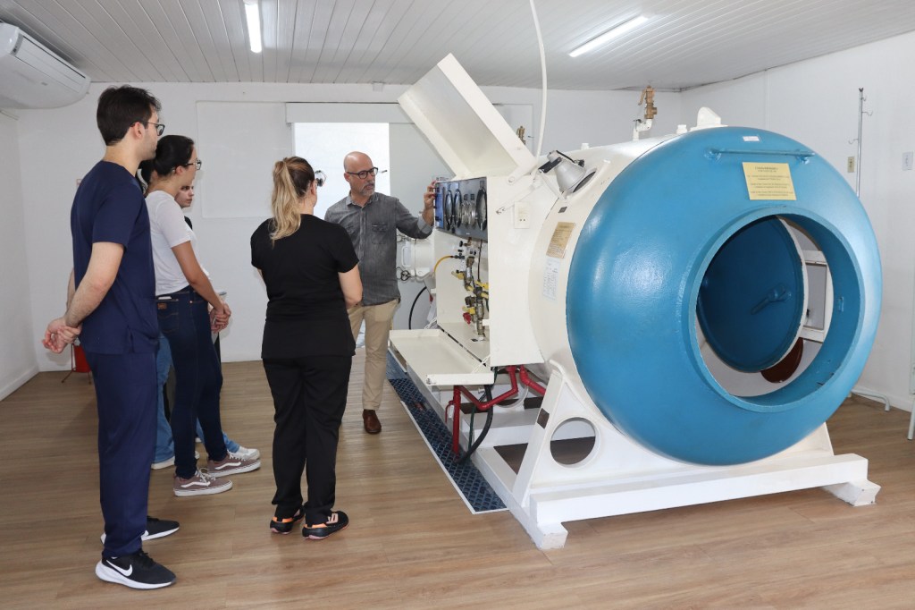 Durante a atividade, os futuros médicos puderam compreender de forma aprofundada como funciona o atendimento nessa especialidade, observando casos clínicos frequentes e os protocolos utilizados. Um dos destaques foi a câmara hiperbárica, equipamento essencial no tratamento de condições que requerem a administração de oxigênio em alta pressão. A tecnologia permite que o oxigênio se dissolva em maior quantidade no plasma, o que acelera a cicatrização e ajuda a combater infecções graves.